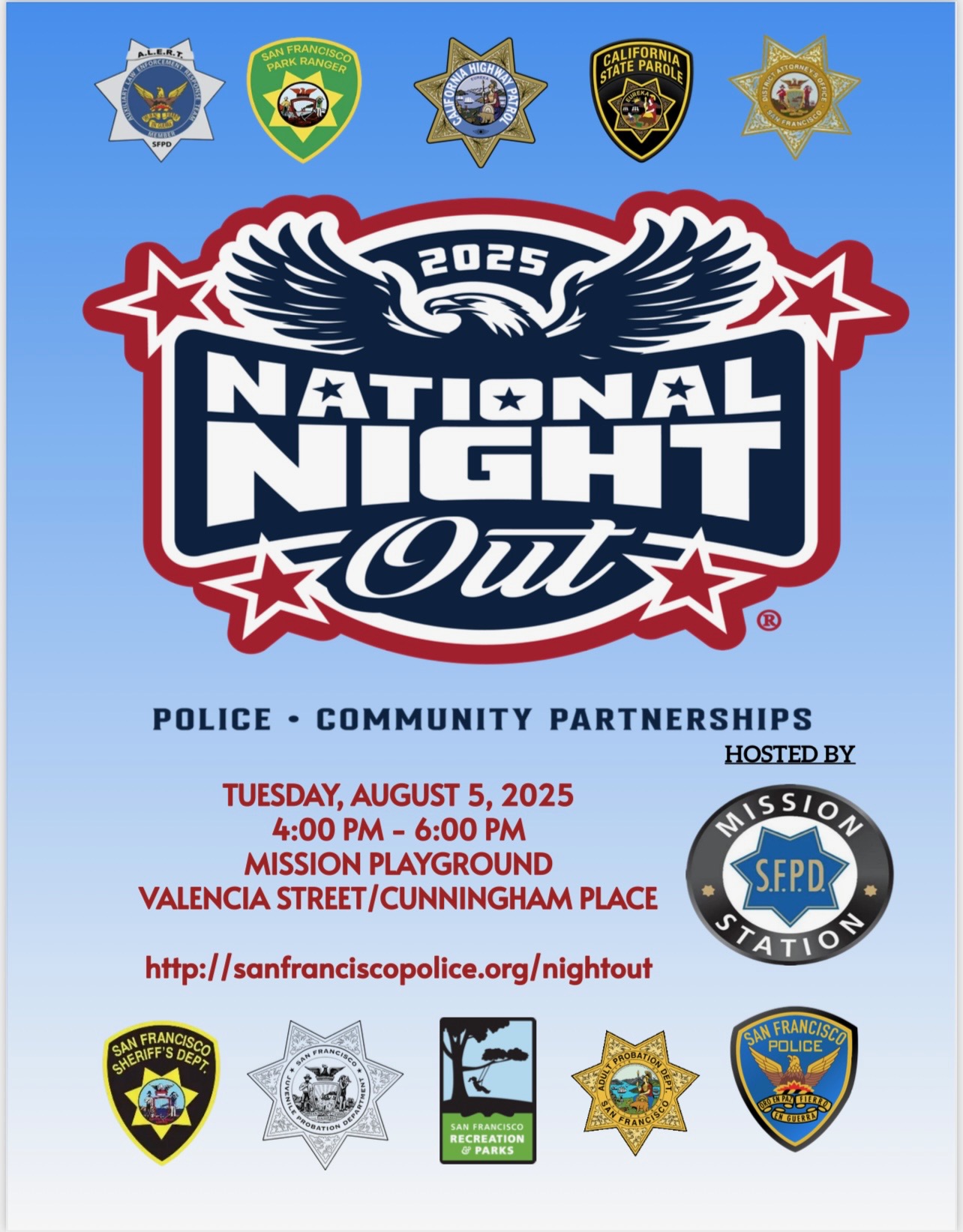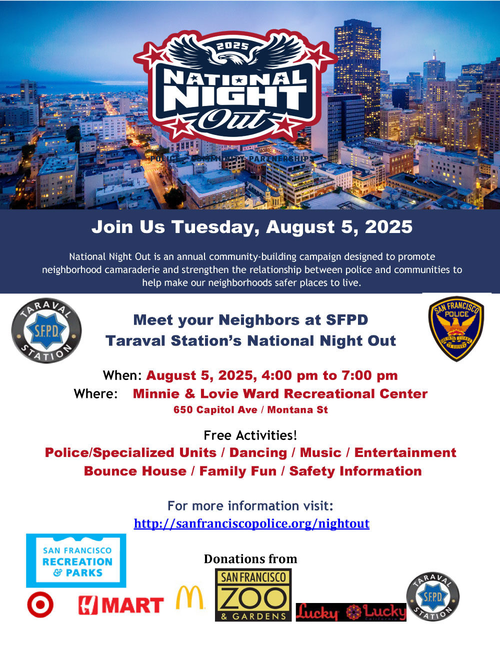 Meet your Neighbors at SFPD Taraval Station’s National Night Out! Free Activities! Police/Specialized Units / Dancing / Music / Entertainment - Bounce House / Family Fun / Safety Information