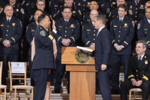 In a packed City Hall ceremony, the 22-year police veteran took the oath of office before hundreds of officers and city leaders, pledging his unwavering commitment to public safety and community trust. It drew significant civic leadership, including Mayor Daniel Lurie, District Attorney Brooke Jenkins, state Senator Scott Wiener, and state Controller Malia Cohen.